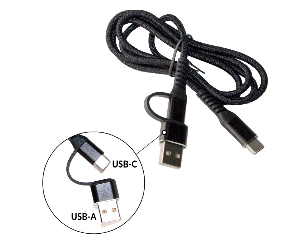 Kabel USB z adapterem USB-C spełnia dwie funkcje, może służyć jako kabel ładujący urządzenie bądź kabel za pomocą którego podłączymy urządzenia do komputera.