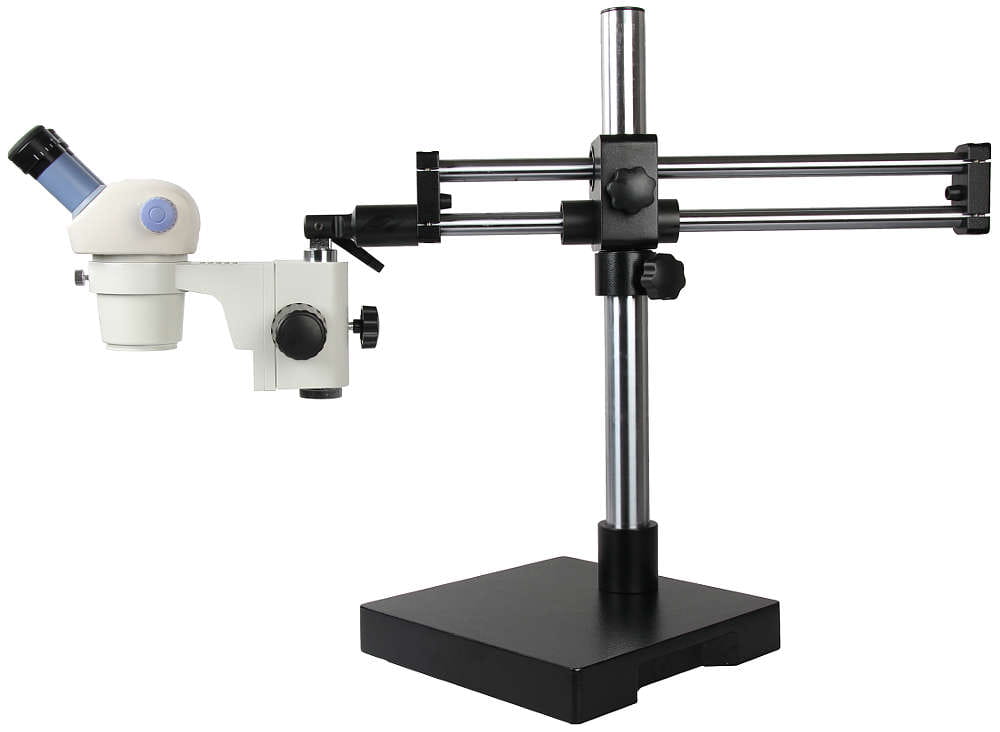 Głowica stereoskopowa umieszczona na uniwersalnym statywie wysięgnikowym ST-3 (F3). Jego budowa pozwala na ustawianie głowicy pod dowolnym kątem. Solidne, metalowe ramię i ciężka podstawa, zwiększają stabilność całego zestawu.Mikroskop charakteryzuje się dużą odległością roboczą (230 mm). Maksymalne podniesienie uchwytu głowicy względem blatu to ok. 460 mm, a maksymalna odległość osi optycznej głowicy stereoskopowej zamocowanej w uchwycie głowicy od osi pionowego ramienia to ok. 660 mm. Pozwala to umieszczać i obserwować pod nim spore obiekty.