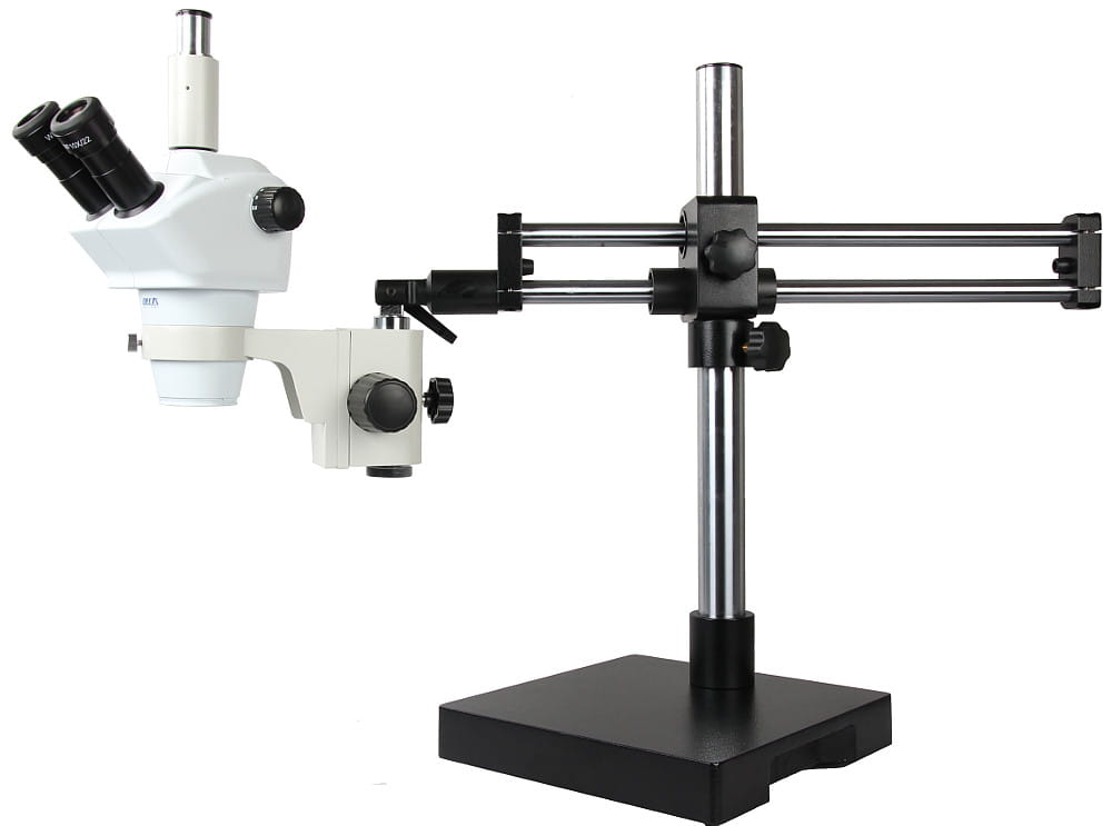 Trinokularowa głowica stereoskopowa o zakresie powiększeń 8-50x.