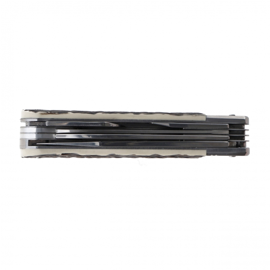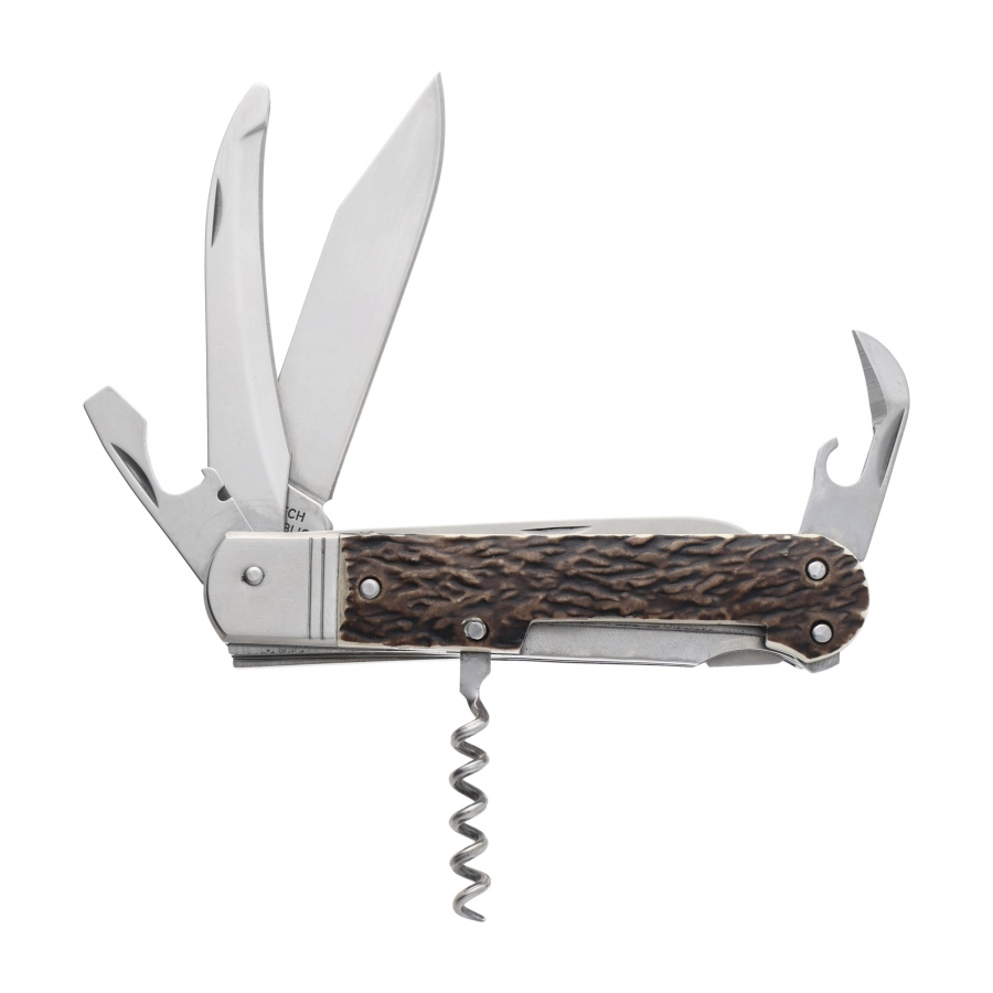 Chropowata faktura tworzywa zapewnia pewny i wygodny chwyt oraz podkreśla myśliwski charakter scyzoryka. Nóż wyposażono w zestaw specjalistycznych narzędzi, przydatnych podczas polowania, biwaku i wypadku do lasu. m.in. dwurządową piłę do drewna i kości, specjalne ostrze do skórowania (down blade) oraz duże ostrze blokowane po rozłożeniu.