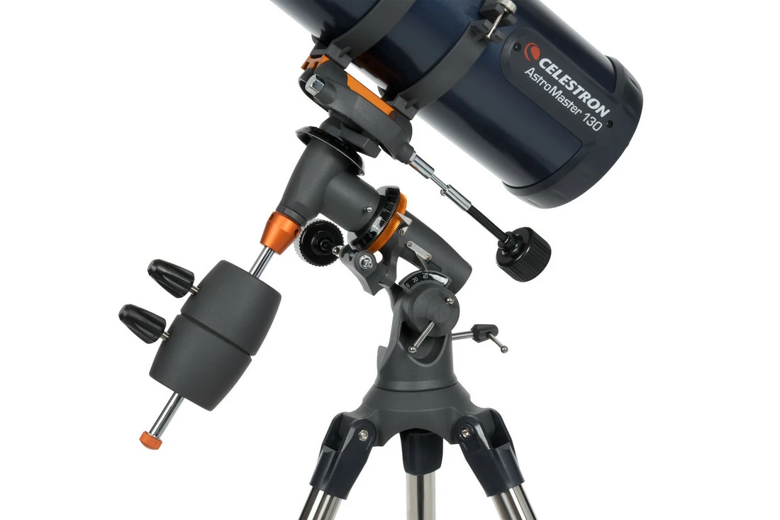 Teleskop mocujemy na montażu paralaktycznym CG-2 przeznaczonym do obserwacji astronomicznych. Po odpowiednim ustawieniu montażu na północny biegun niebieski możemy w łatwy sposób podążać za obserwowanym obiektem w jego ruchu po nieboskłonie. Model Astromaster 130 EQ MD wyposażony jest w napęd w jednej osi, umożliwiający automatyczne śledzenie obiektu, co w dużym stopniu podnosi komfort obserwacji. Dzięki temu możemy również podjąć pierwsze próby wykonania zdjęć obiektów nocnego nieba. Nogi montażu są rozsuwane, całość zaś jest wystarczająco stabilna by minimalizować drgania podczas obserwacji.